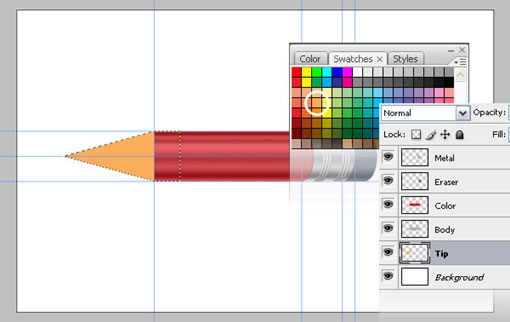 建立一个新层,取名“Tip”。使用“多边形套索工具”画出一个笔头,填上浅黄色,就像下图那样。把这层放在“body”下面。