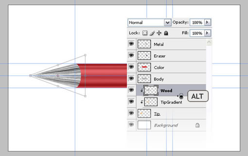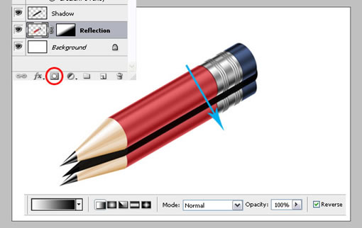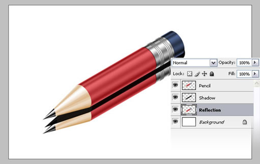 现在我们即将完成。除了背景层外,选择所有的层,把它们合并,取名“Pencil”。复制“Pencil”层,取名“Reflection”,把它放在“Pencil”层下面。