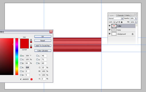 新建一层,建立一个“body”的选区,并填上红色,颜色代号d60005。然后设置层的不透明度为60%,把这层取名为“color”