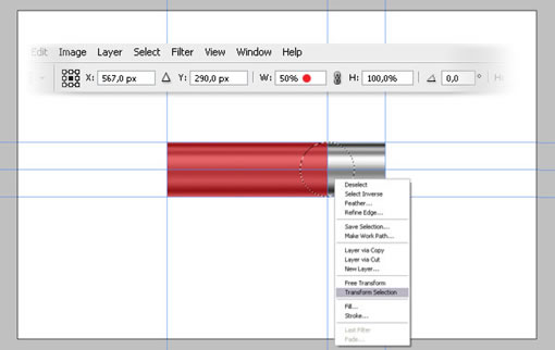 然后点击右键,选择“变换选区”把宽度(W)设为50%,接着敲击2次回车已确定。下来删除选区中的部分,这样就给了我们一个铅笔的透视角度。