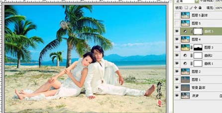 巧用曲线修复灰暗的海景结婚照片