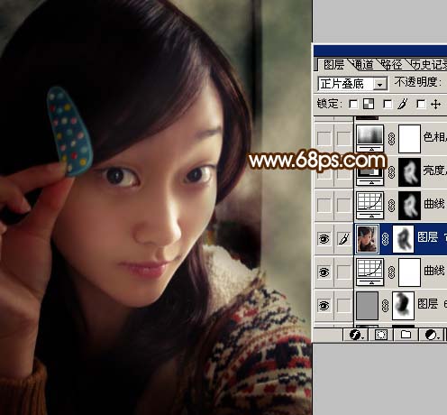6、新建一个图层,盖印图层,把图层混合模式改为“正片叠底”,加上图层蒙版用黑色画笔把人物脸部稍微擦出来,效果如图9。
