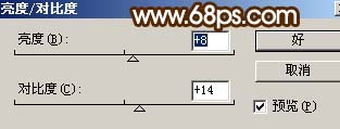 8、创建亮度/对比度调整图层,参数设置如图13,确定后只保留人物脸部,其它地方用黑色画笔擦掉,效果如图14。