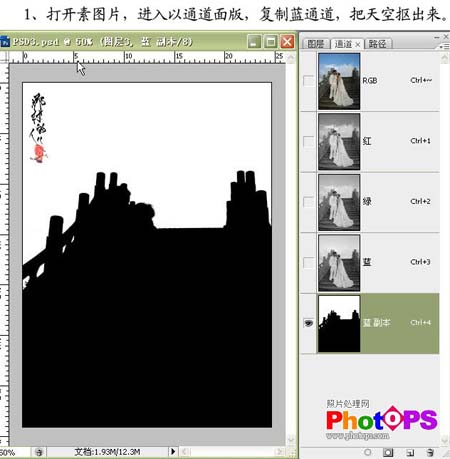 1、打开原图素材,进入通道面板,把蓝色通道复制一层,把天空部分抠出来。