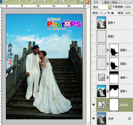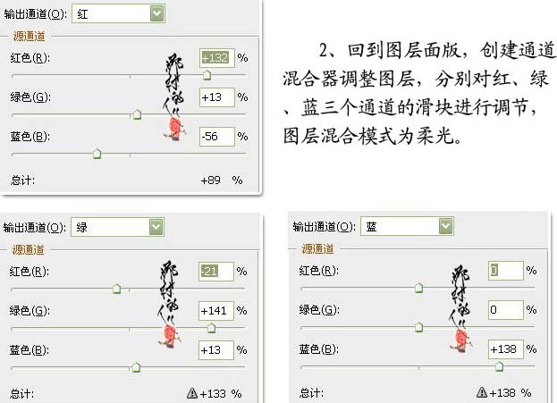 2、回到图层面板,创建通道混合器调整图层,参数设置如下图,确定后把图层混合模式改为“柔光”。