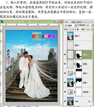 5、打开下图纱纹素材,用通道抠图法把纱纹部分抠出来,然后把抠出的纱巾去色,然后拖到刚才操作的婚片图层里面,摆好位置,加上图层蒙版用黑色画笔擦掉不需要的部分,图层不透明度改为:90%,复制一层图层混合模式改为“正片叠底”。