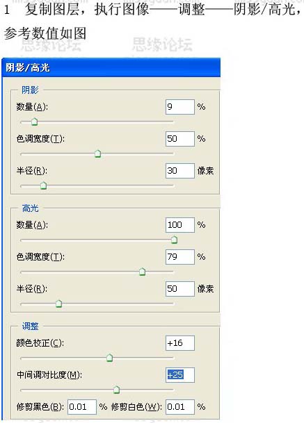 1、打开原图素材,按Ctrl + J把背景图层复制一层,执行:图像 > 调整 > 阴影/高光,参数设置如下图。