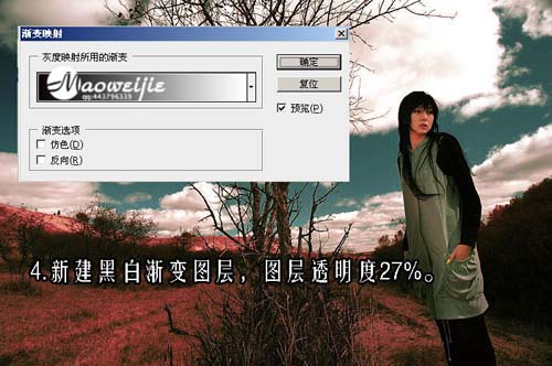 #p# 4、创建渐变映射调整图层,颜色选择黑白,确定后把图层的不透明度改为:27%。