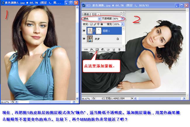 现在再把图1的皮肤图层图层混合模式改为“颜色”,适当降低不透明度。加上图层蒙版,用黑色画笔擦去眼睛等不需要变色的地方,比较下,肤色非常接近了。