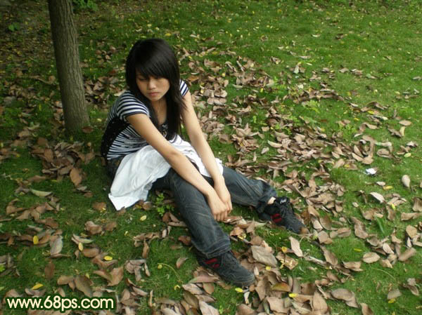 原图素材地面的树叶感觉非常不错,给人一种忧郁深思的感觉。教程调色时候重点在树叶部分,把草地等地方调深处理。更加突出人物和背景。