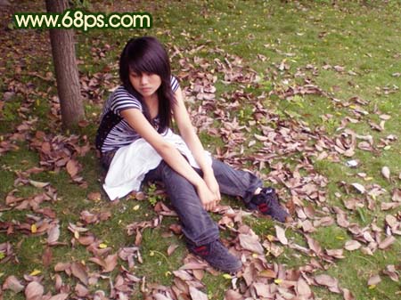 原图素材地面的树叶感觉非常不错,给人一种忧郁深思的感觉。教程调色时候重点在树叶部分,把草地等地方调深处理。更加突出人物和背景。