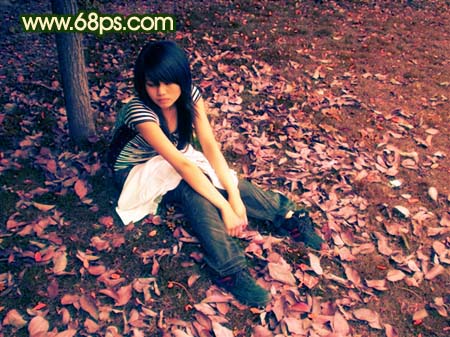 原图素材地面的树叶感觉非常不错,给人一种忧郁深思的感觉。教程调色时候重点在树叶部分,把草地等地方调深处理。更加突出人物和背景。