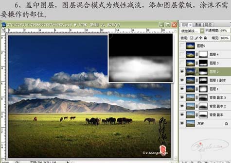 6、新建一个图层,盖印图层,图层混合模式改为“线性减淡”,加上图层蒙版,用黑色画笔涂抹不需要操作的部分。