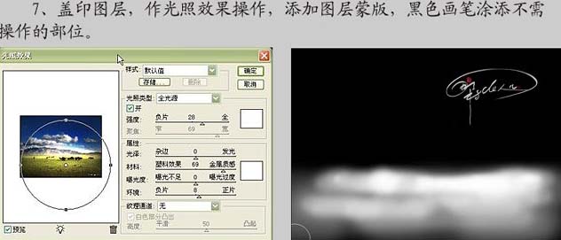7、新建一个图层,盖印图层,执行:滤镜 > 渲染 > 光照效果,参数设置如下图,确定后加上图层蒙版,用黑色画笔擦掉不需要操作的部位。
