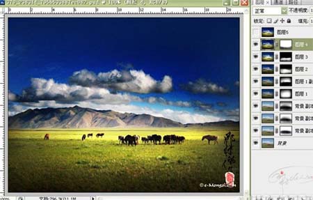 1、打开素材图片,把背景图层复制一层,图层混合模式改为“正片叠底”,加上图层蒙版,用黑色画笔涂抹马的周围。