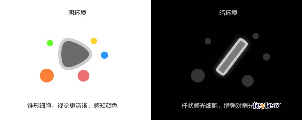 ② 因为视觉适应的原理,我们在光线充足的时候阅读黑底白字的信息,视觉聚焦于白色文字,黑色背景也会更暗,眼睛需要进行暗适应,所以会加速视觉疲劳。而在夜晚则相反,眼睛已经是暗适应的状态,阅读黑底白字的信息,不需要进行视觉适应,疲劳感不会增加。所以在晚上使用深色底浅色字的夜间模式会减少刺激,使眼睛更舒服。