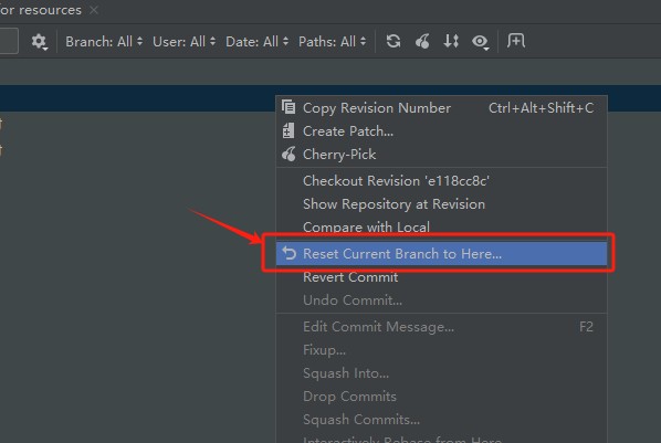 选择需要回滚到那个版本的提交记录,右键点击【Reset Current Branch to Here…】