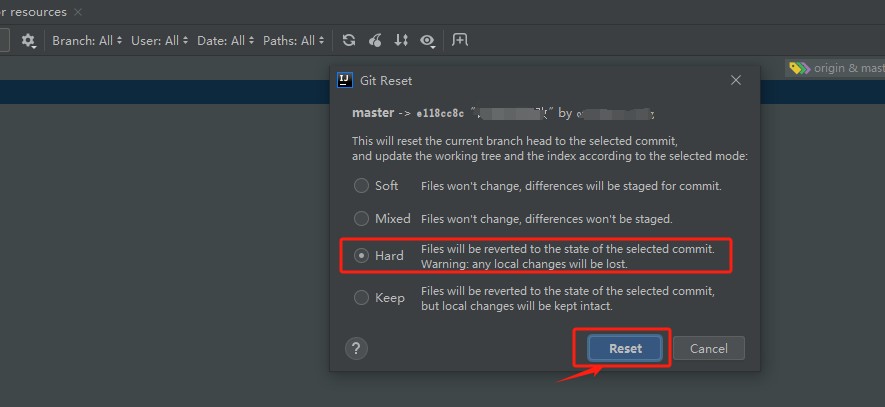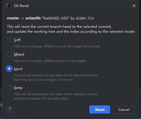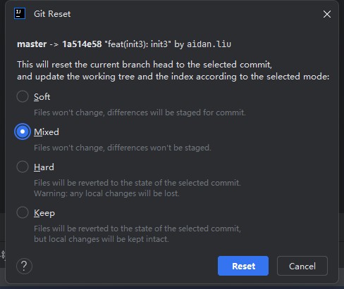 | Mixed | 回滚到指定版本,并保留所有更改,但是更改将不会被重新提交(文件进入到Unversioned Files中)。使用这种模式,你可以撤销已经提交的更改,并保留这些更改,以备后续修改和提交。 |