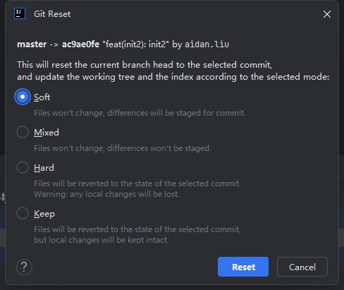 | Soft | 回滚到指定版本,并保留所有更改,这些更改将被重新提交。使用这种模式,你可以撤销已经提交的更改,然后重新提交。 |