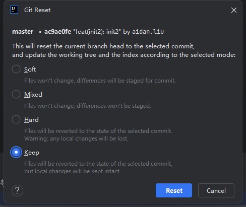 | Keep | 回滚到指定版本,但是保留指定版本之后的更改。使用这种模式,你可以撤销指定版本之后的更改,并保留这些更改,以备后续修改和提交。 |
