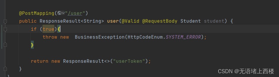 RuntimeException 是 Java 提供的一个运行时异常类。与受检查异常不同,运行时异常不需要在方法声明中显式地声明或捕获,并且在运行时抛出时也不需要强制捕获或处理。所以我们可以在全局异常捕获中去捕获这个异常