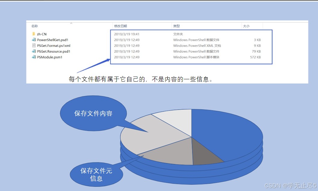 比如你在电脑上看到的“PSGet.Format.ps1xml”文件,它的元信息就包括“修改日期 2019/3/19”“类型 Windows PowerShell 数据文件”“大小 9KB”,这些信息和文件内容是分开保存的。