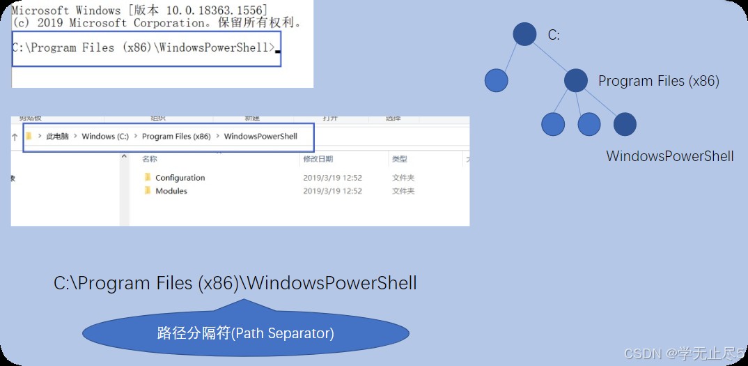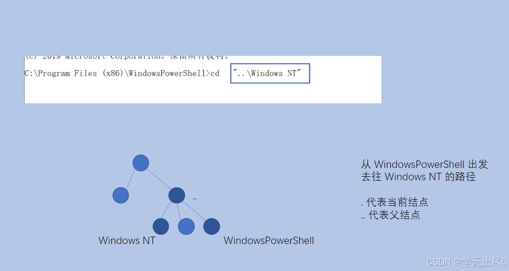 - 相对路径:从当前目录出发的路径,比如从“WindowsPowerShell”目录去“Windows NT”,用