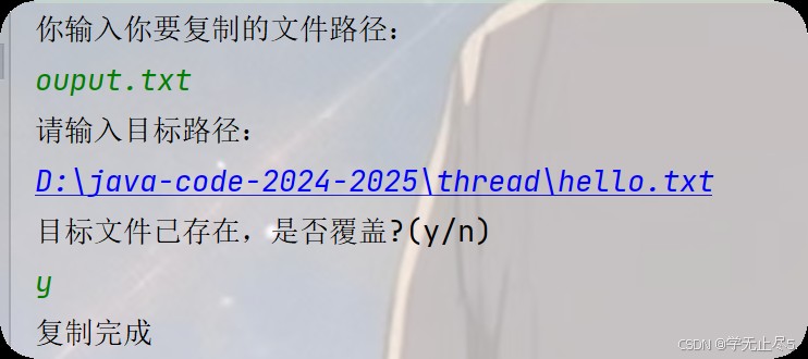 System.out.print("目标文件已存在,是否覆盖?(y/n)");