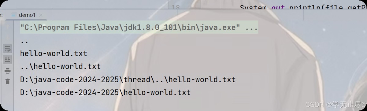 System.out.println(file.getAbsolutePath()); // 输出绝对路径:D:\代码练习\文件示例1\..\hello-world.txt