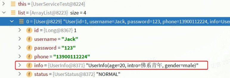 测试可以发现,所有数据都正确封装到UserInfo当中了: