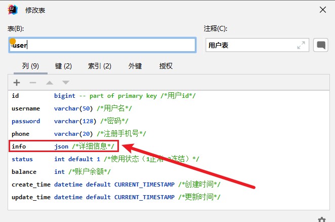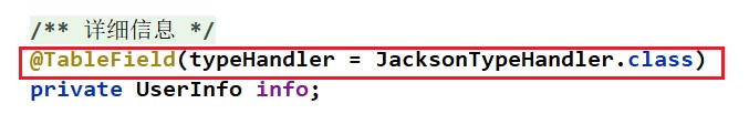 这样一来,我们要读取info中的属性时就非常不方便。如果要方便获取,info的类型最好是一个Map或者实体类。这样一来,我们要读取info中的属性时就非常不方便。如果要方便获取,info的类型最好是一个Map或者实体类。MybatisPlus提供了很多特殊类型字段的类型处理器,解决特殊字段类型与数据库类型转换的问题。例如处理JSON就可以使用JacksonTypeHandler处理器。