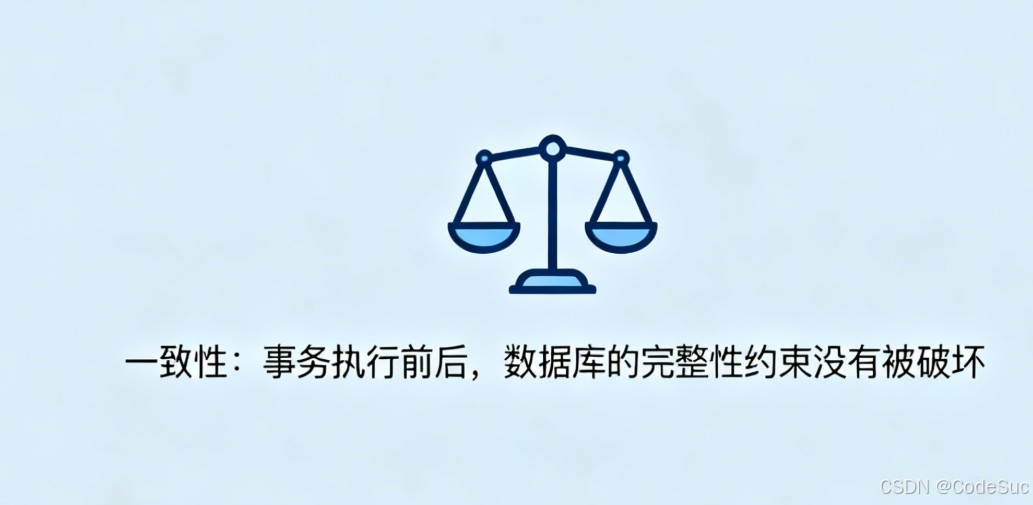 一致性是指事务执行前后,数据库中的数据必须处于一个合法、一致的状态,即数据需要满足业务规则和完整性约束。一致性是事务的最终目标,其他三个特性都是为了保障一致性而存在的。