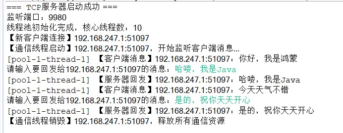 监听端口(ServerSocket)→ 线程池分配工作线程 → 读取客户端消息(按行解析) → 控制台输入回发消息 → 客户端接收并展示