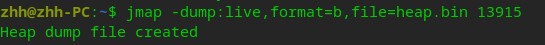 jmap -dump:live,format=b,file=heap.bin 13915 jmap [options] pid -dump:dump_options pid Connects to a running process and dumps the Java heap. The dump_options include: live --- When specified, dumps only the live objects; if not specified, then dumps all objects in the heap. format=b --- Dumps the Java heap in hprof binary format file=filename --- Dumps the heap to filename Example: jmap -dump:live,format=b,file=heap.bin pid