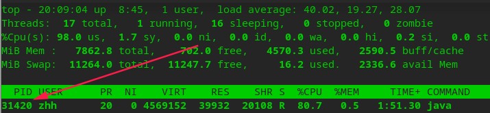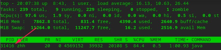 方法一:top命令列出进程信息,按P(shift+p)让CPU占用率由高到低排序(按M是内存),由此看到最高的是java进程,PID为31416。