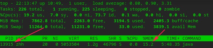 }top命令列出进程信息,按M(shift+m)让内存占用率由高到低排序(按P是CPU),由此看到最高的是java进程,PID为13915。