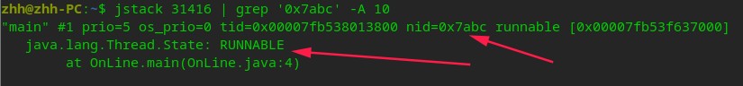 jstack 进程ID | grep '0x线程ID' -A 10