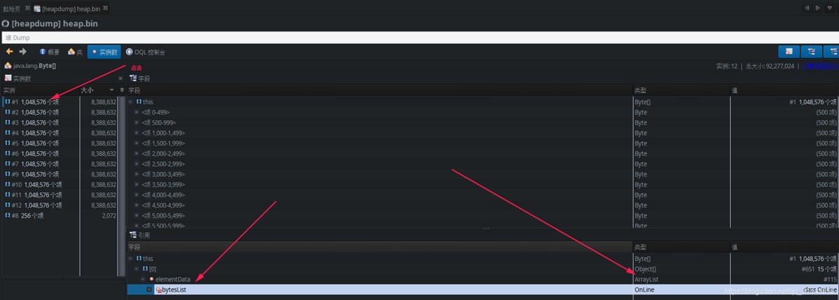 双击类所在行(比如上面的java.lang.Byte[]),选择实例,可以看到详细引用信息了