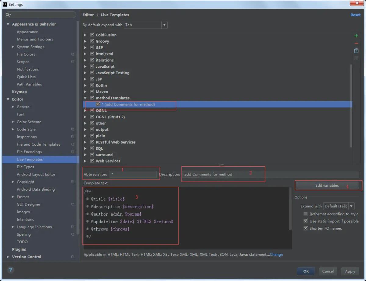 - 在位置3处: 输入方法注释模板样式,可变变量要用 变量名变量名变量名 来表示,如:paramparamparam;