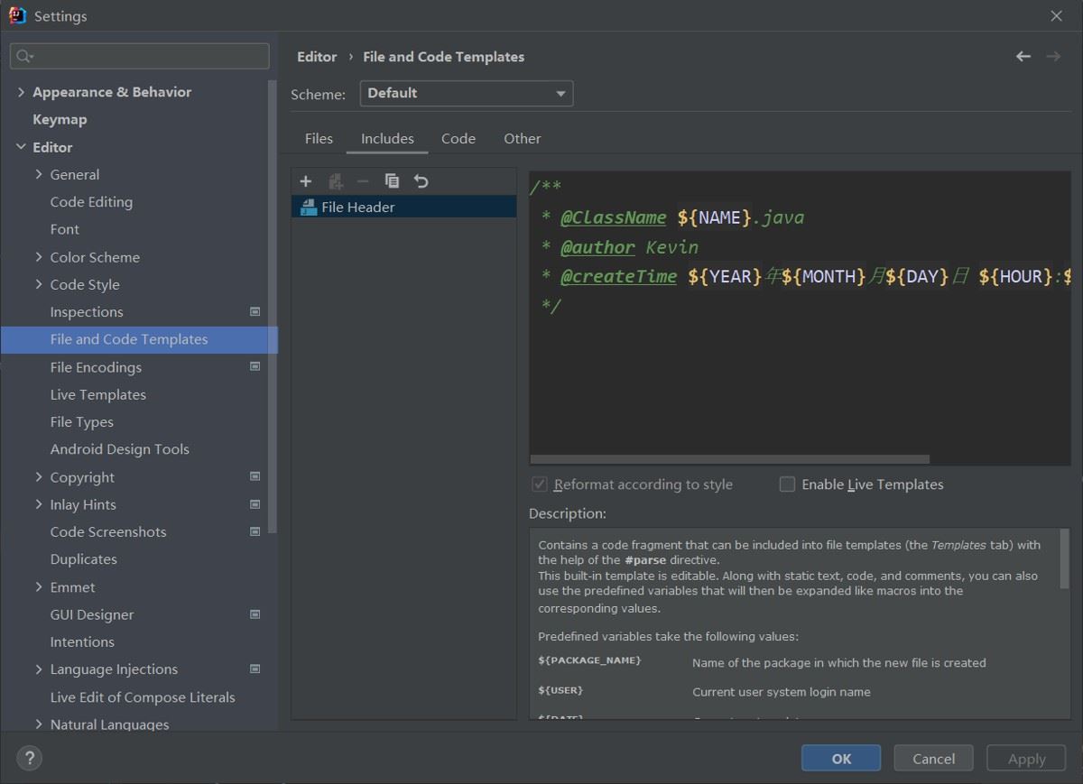 这句代码是引入了File Header.java文件,作为我们创建的Class Interface ,Enum 等文件的注释,那么这个类在哪呢,我们可以看到,在 Files 右侧,有一个 Includes 选项,