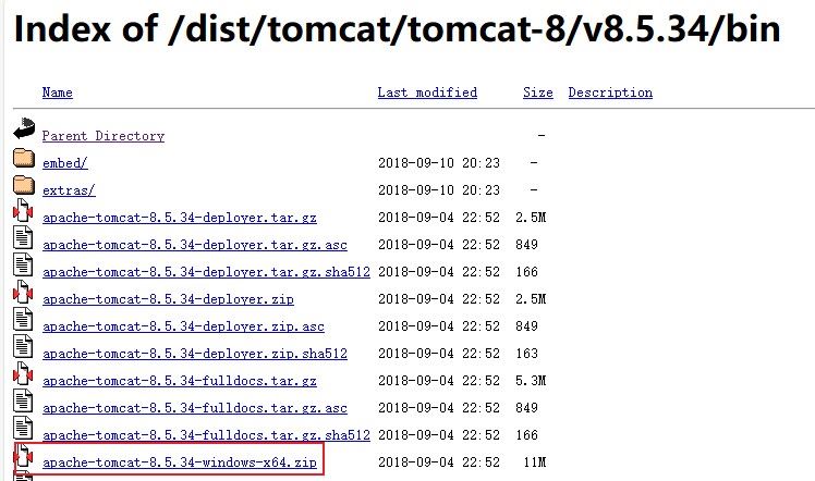 进入该网址:https://archive.apache.org/dist/tomcat/tomcat-8/v8.5.34/bin/