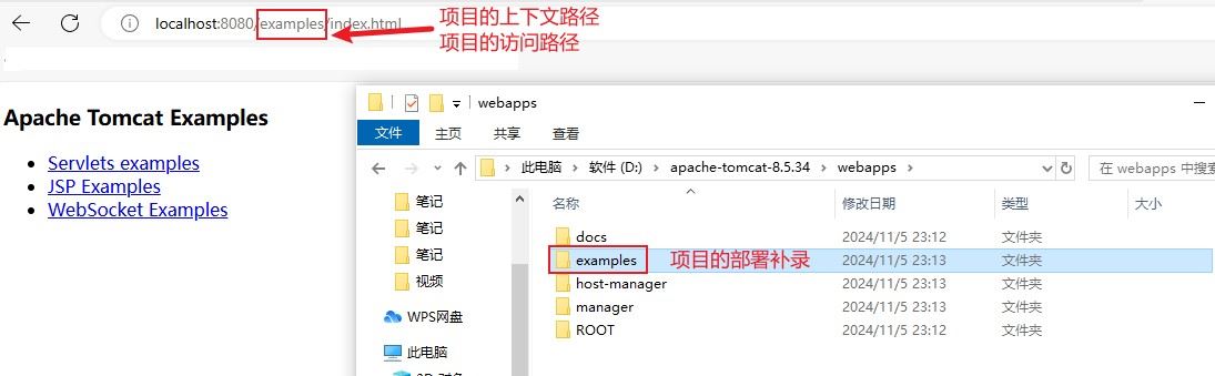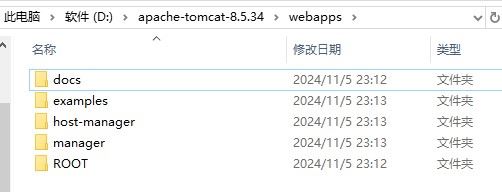 - webapps:存放web项目的目录,其中每个文件夹都是一个项目;如果这个目录下已经存在了目录,那么都是tomcat自带的项目。其中ROOT是一个特殊的项目,在地址栏中访问:http://127.0.0.1:8080,没有给出项目目录时,对应的就是ROOT项目。http://localhost:8080/examples,进入示例项目。其中examples"就是项目名,即文件夹的名字。