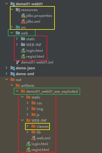 - static和WEB-INF对应demo01_web01_war_exploded下的static和WEB-INF;