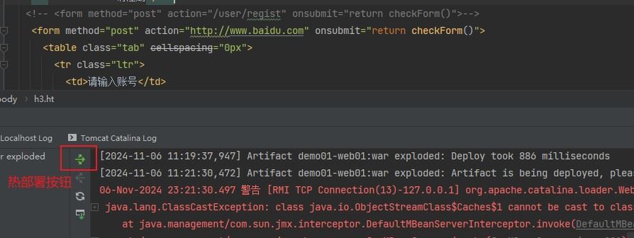 当想要修改代码时,不需要重启Tomcat服务,点击热部署按钮即可。