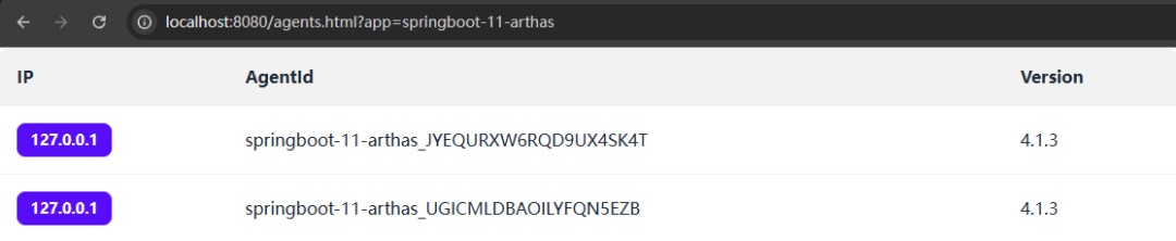 然后访问管理页面查看所有已连接的 arthas 客户端,管理页面地址是:服务器ip:端口号/apps.html。显示如下图所示: