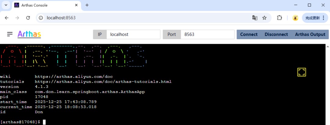 接下来通过浏览器,可以进入 Arthas 的 Web Console。使用配置文件配置的 http-port: 8563 端口。如下所示: