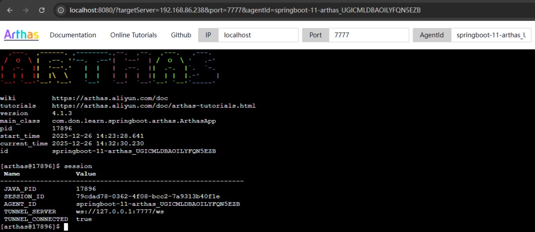 可以通过 http://127.0.0.1:8080/actuator/arthas 查看到具体的连接信息,登录用户名是 arthas,密码在 Tunnel Server的日志里可以找到,比如: