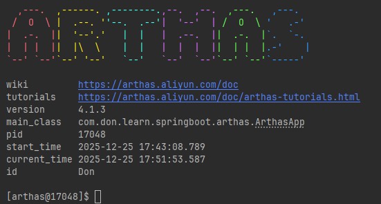 经过上述的配置,Spring Boot 项目启动时,会自动启动 Arthas,并 attach 自身进程。启动项目控制台日志如下: