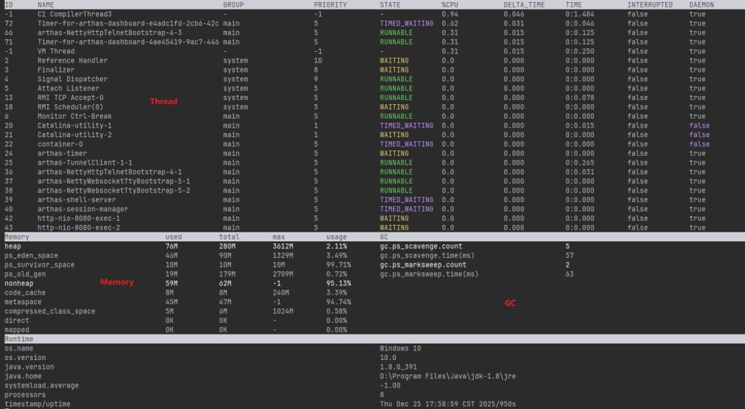 接下来就可以在 arthas 终端执行各种 arthas 指令调试代码,详细使用方法可以参考 Arthas 文档。如 dashboard :