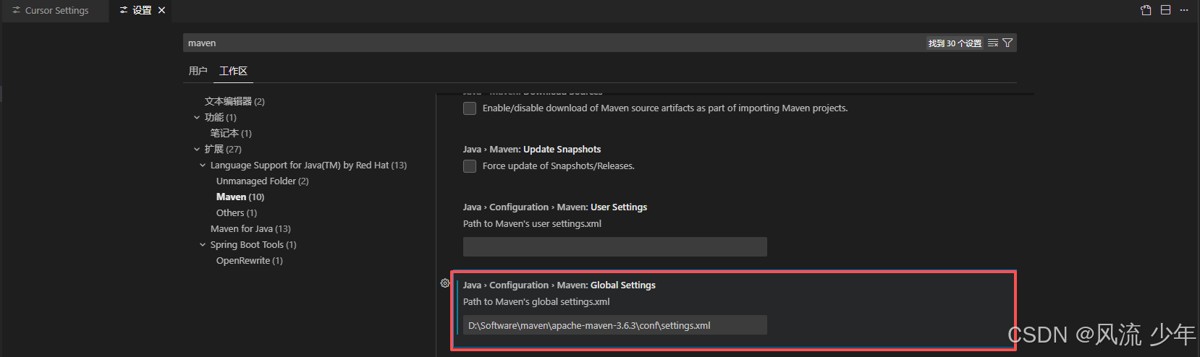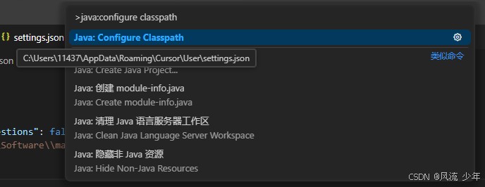 JAVA_HOME和MAVEN_HOME,如果没有配置去找默认路径~/.m2/settings.xml - 也可以手动指定:Ctrl + Shift + P 输入"Preferences:Open User Settings(JSON)"打开settings.json文件,然后新增配置,保存后重新加载。